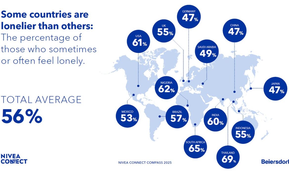นีเวีย ได้เผยผลการวิจัย NIVEA CONNECT COMPASS เป็นครั้งแรก ซึ่งเป็นการศึกษาระดับโลกว่าด้วยความเหงาและการแยกตัวออกจากสังคม งานวิจัยนี้จัดทำขึ้นใน 13 ประเทศ ครอบคลุม 5 ทวีป พบว่าความเหงาเป็นปรากฏการณ์ระดับโลกที่ส่งผลกระทบต่อผู้คนนับล้าน และกำลังกลายเป็นวิกฤติที่สร้างผลกระทบลึกซึ้งทั้งต่อสุขภาพจิตและสุขภาพกายมากกว่าครึ่งของผู้ตอบแบบสอบถาม (56%) ยอมรับว่ามีความรู้สึกเหงาอย่างน้อยเป็นบางครั้ง 57% ระบุว่ามีช่วงเวลาที่รู้สึกว่าตนเองอยู่ลำพัง และ 54% เผชิญกับความรู้สึกว่าแยกจากผู้อื่น ขณะที่เกือบครึ่งหนึ่ง (47%) ระบุว่ารู้สึกถูกทอดทิ้งอย่างน้อยเป็นบางครั้ง