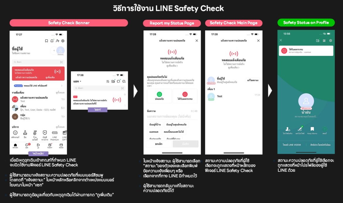 เมื่อเกิดภัยพิบัติหรือเหตุฉุกเฉิน ระบบของฟีเจอร์ LINE Safety Check จะปรากฏขึ้นโดยอัตโนมัติ ผู้ใช้จะเห็นแบนเนอร์หรือการแจ้งเตือนภายในแอป LINE และสามารถแจ้งสถานะความปลอดภัยของตนเองได้ทันที ผ่านขั้นตอนง่าย ๆ ดังนี้